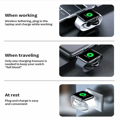 Apple Watch charger that plugs into a USB port.  Charge your watch anywhere by just plugging into a USB port.  No long cables needed a small device that will charge any size of Apple watch.