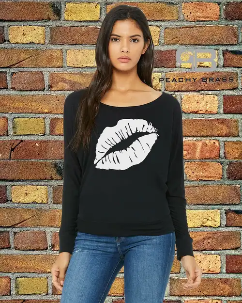 Be cute and make a statement with this off the shoulder lips shirt. Shirts contains a cotton polyester blend for a relax and comfortable feel.
