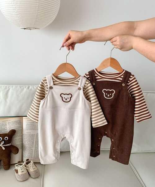 • Infant Baby Unisex Bear Head Corduroy Combo Overalls In Sets